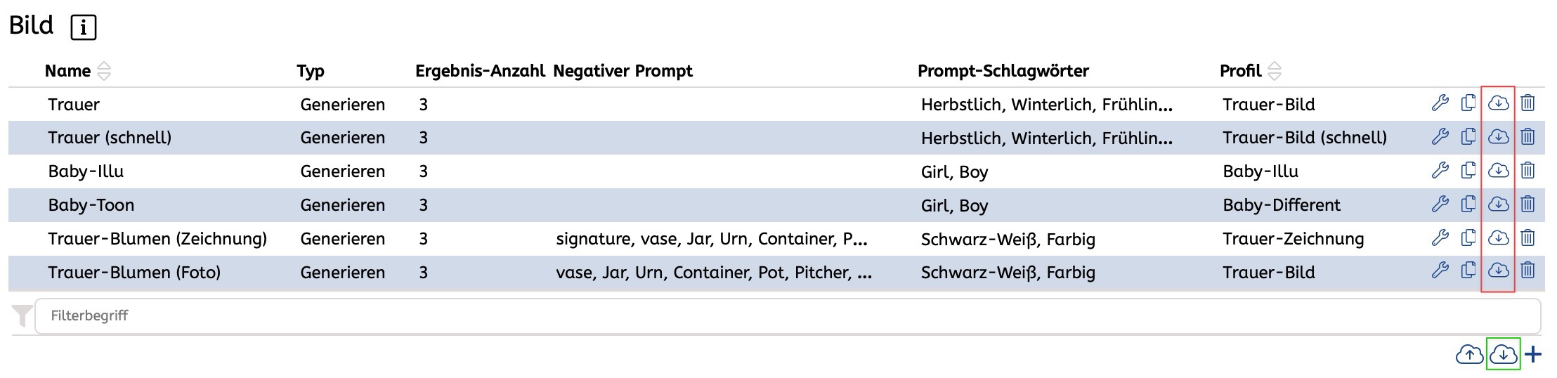 Die Icons in den Zeilen (rot umrandet) exportieren die einzelnen Prompt-Kombinationen. Grün umrandet werden alle existierenden Prompts exportiert.