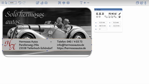 The align functions are also available without further configuration options via the Floating Toolbox for Graphic Objects and the Object Palette. In the following example, the lower text frame is first adjusted to the size of the other text frames, before in the second step all text frames are selected and the left position is aligned to the first text frame.
