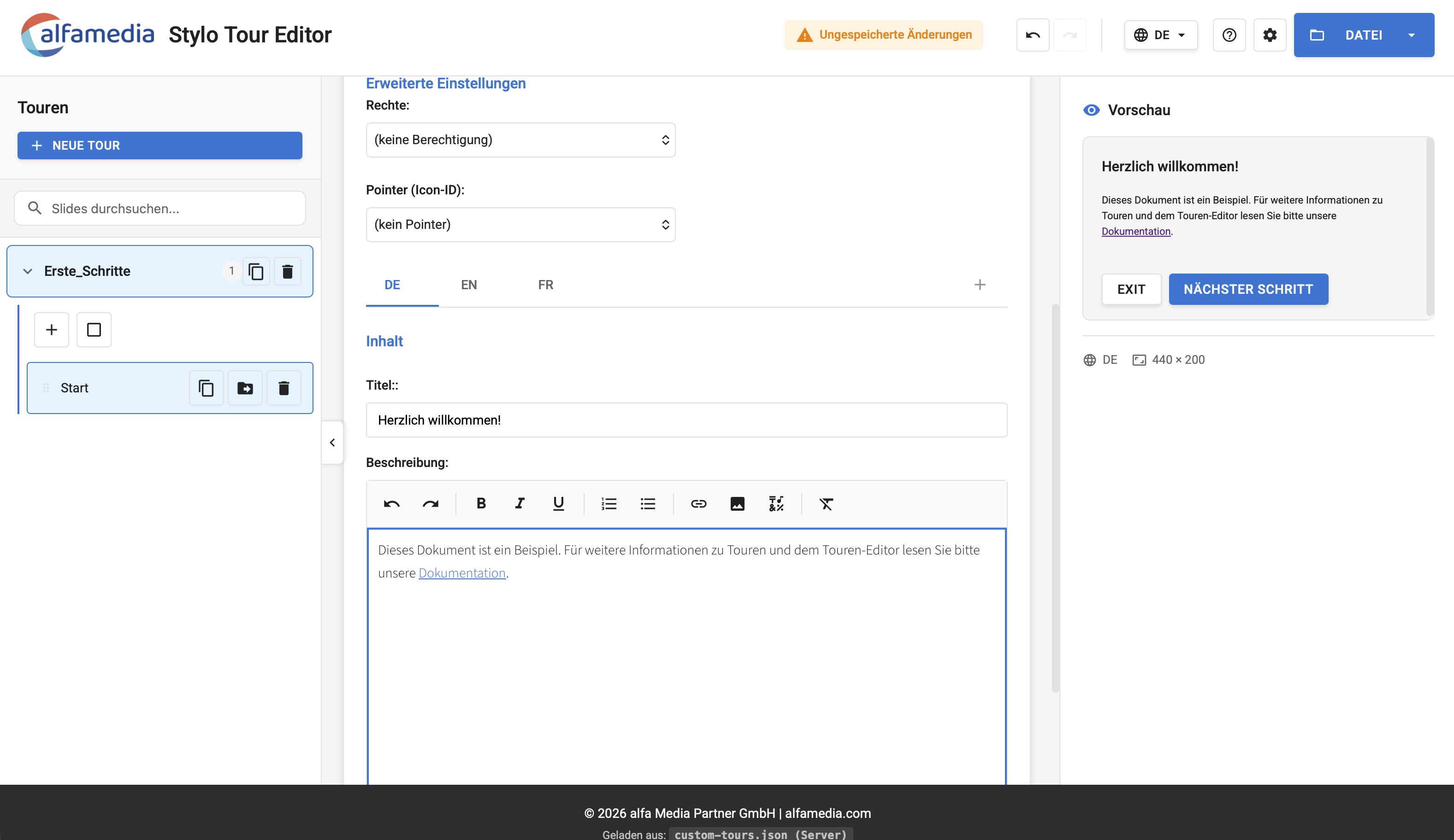 Les deux tours fournies sont conçues pour expliquer les principales fonctions et opérations de l'éditeur et fournir des indications sur ce à quoi pourraient ressembler des tours définies spécifiquement pour l'éditeur.